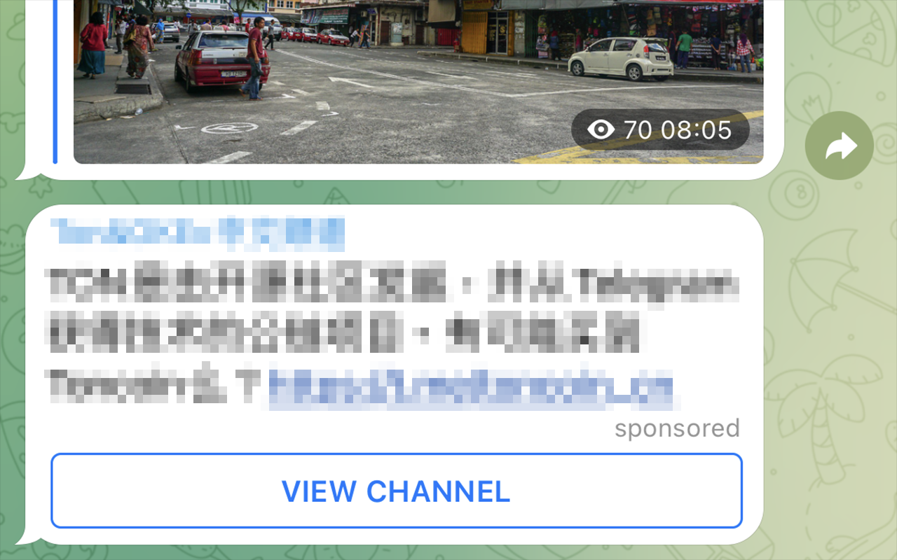 Tg的广告形式主要包括2种,一种是通过在各种频道信息流里面进行广告推送的方式,有点类似于国内微信群和公众号里面推送图文广告;一种是通过Tg平台上的各类miniapp上的广告位进行广告展示,这种有点类似微信的小程序内的广告。